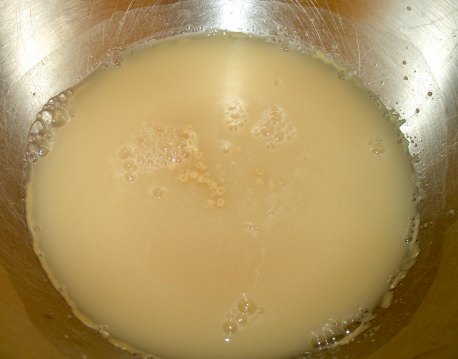 In a deep bowl (or mixing bowl) dissolve the yeast in the water.