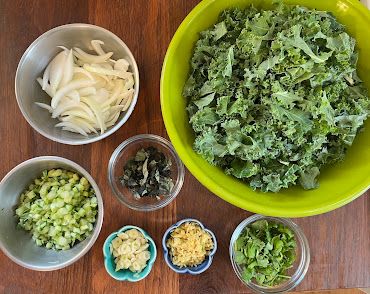 Strip the leaves from the kale stalks and coarsely chop them. Then finely chop the stalks. Keep the two separate.